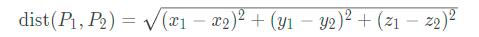 空间内两点 P1(x1,y1,z1)、P2(x2,y2,z2) 的距离公式如下: