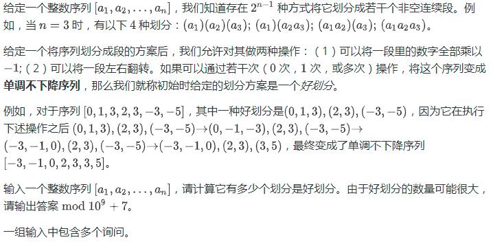 输出共有 T 行,对每一组询问请输出好划分的数量mod 10^9 + 7。