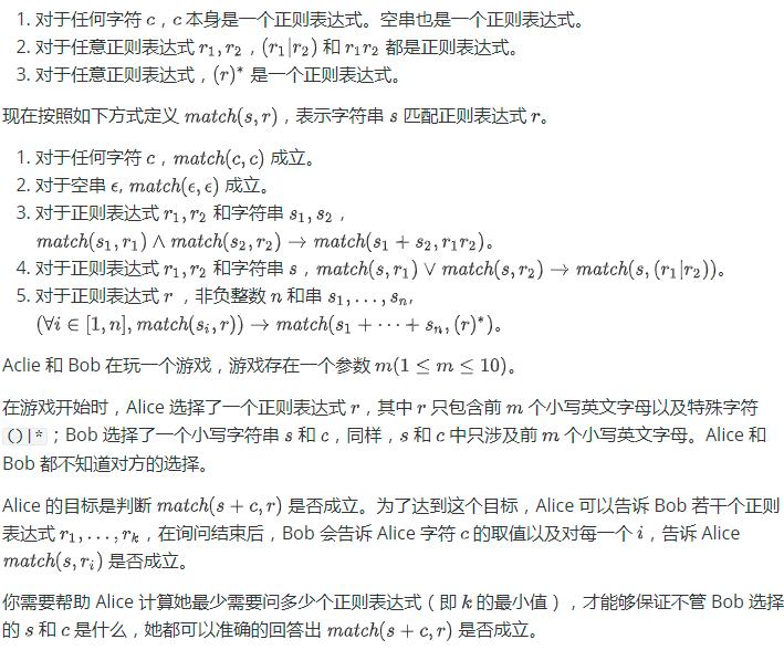 这个时候,Alice 的一个最优方案是询问 ((a)*|(d)*) 和 ((b)*|(c)*)