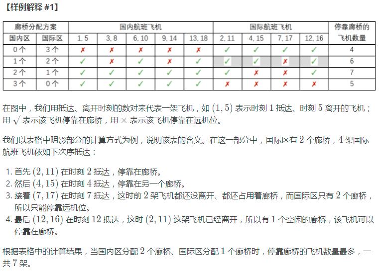 输出一个正整数,表示能够停靠廊桥的飞机数量的最大值。