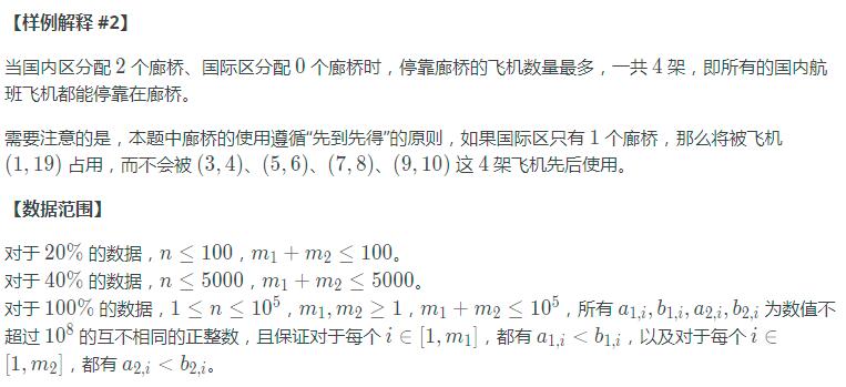 接下来 m2 行,是国际航班的信息,第 i 行包含两个正整数 a2,i,b2,i,分别表示一架国际航班飞机的抵达、离开时刻。