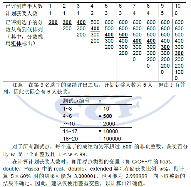 在计算计划获奖人数时,如用浮点类型的变量(如 C/C++ 中的 float 、 double,Pascal 中的 real 、 double 、 extended 等)存储获奖比例 w%,则计算 5×60% 时的结果可能为 3.000001,也可能为 2.999999,向下取整后的结果不确定。因此,建议仅使用整型变量,以计算出准确值。