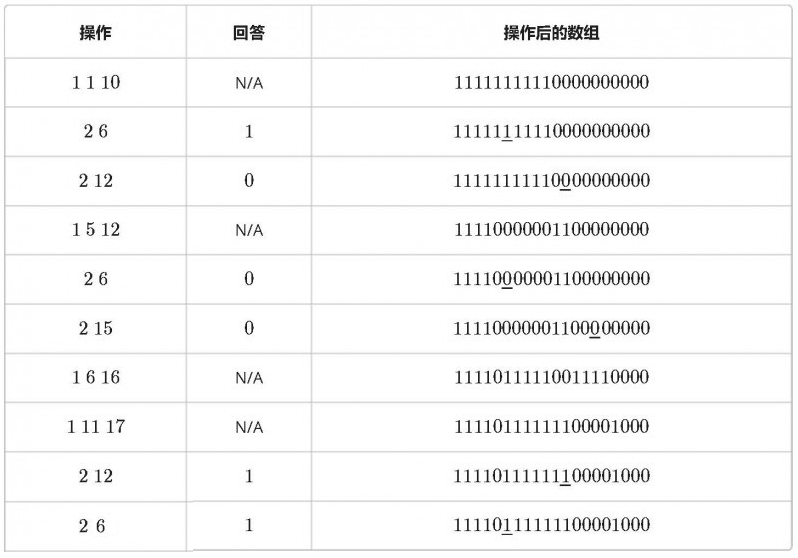 有 m 条指令,要么让其中一段连续序列数字反转——0 变 1,1 变 0(操作 1),要么询问某个元素的值(操作 2)。