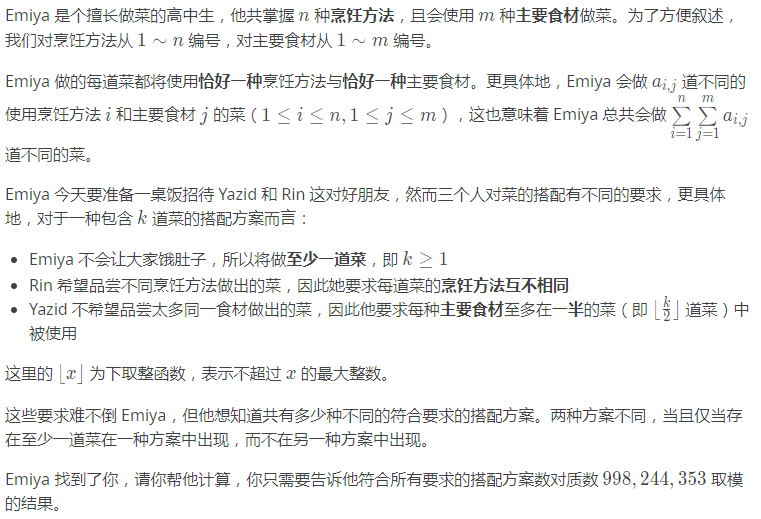因此输出结果为 3 mod 998,244,353=3。 需要注意的是,所有只包含一道菜的方案都是不符合要求的,因为唯一的主要食材在超过一半的菜中出现,这不满足 Yazid 的要求。