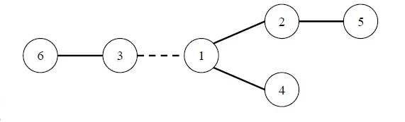 每条道路的修建都要付出一定的费用,这个费用等于道路长度乘以道路两端 的国家个数之差的绝对值。例如,在下图中,虚线所示道路两端分别有 2 个、4 个国家,如果该道路长度为 1,则费用为 1×∣2−4∣=2。图中圆圈里的数字表示国家的编号。