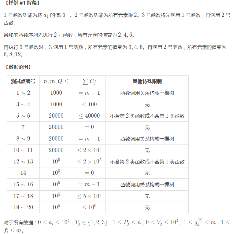 第 m+5 行 Q 个整数 fi,第 i 个整数表示第 i 个执行的函数的编号。