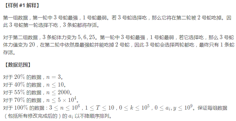 本题有多组数据,对于第一组数据,每条蛇体力会全部由输入给出,之后的每一组数据,会相对于上一组的数据,修改一部分蛇的体力作为新的输入。