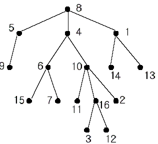 In the figure, each node is labeled with an integer from {1, 2,...,16}. Node 8 is the root of the tree. Node x is an ancestor of node y if node x is in the path between the root and node y. For example, node 4 is an ancestor of node 16. Node 10 is also an ancestor of node 16. As a matter of fact, nodes 8, 4, 10, and 16 are the ancestors of node 16. Remember that a node is an ancestor of itself. Nodes 8, 4, 6, and 7 are the ancestors of node 7. A node x is called a common ancestor of two different nodes y and z if node x is an ancestor of node y and an ancestor of node z. Thus, nodes 8 and 4 are the common ancestors of nodes 16 and 7. A node x is called the nearest common ancestor of nodes y and z if x is a common ancestor of y and z and nearest to y and z among their common ancestors. Hence, the nearest common ancestor of nodes 16 and 7 is node 4. Node 4 is nearer to nodes 16 and 7 than node 8 is.
