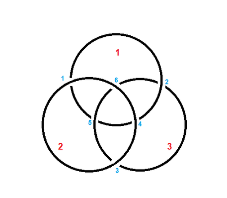 圆环按照图中 1, 2, 3依次编号(红色数字),同时产生了6个交叠点(蓝色数字),并且告诉你每个交叠点的上下叠放情况。