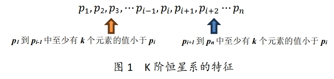 半人马座 A 是个巨大的椭圆星系,具有 n 个恒星。和太阳系一样,每个恒星周围都有许多行星。小可可团队通过太空望远镜,观测出每个恒星系里行星的数量,其中第 i 个恒星系里有 pi(1≤i≤n) 个行星。若第 i 个恒星系为小可可定义的 k 阶恒星系,则在正整数序列 p1,p2,...pn 中, pi 的左边和右边都至少有 k 个元素的值小于 pi(如图 1 所示)。