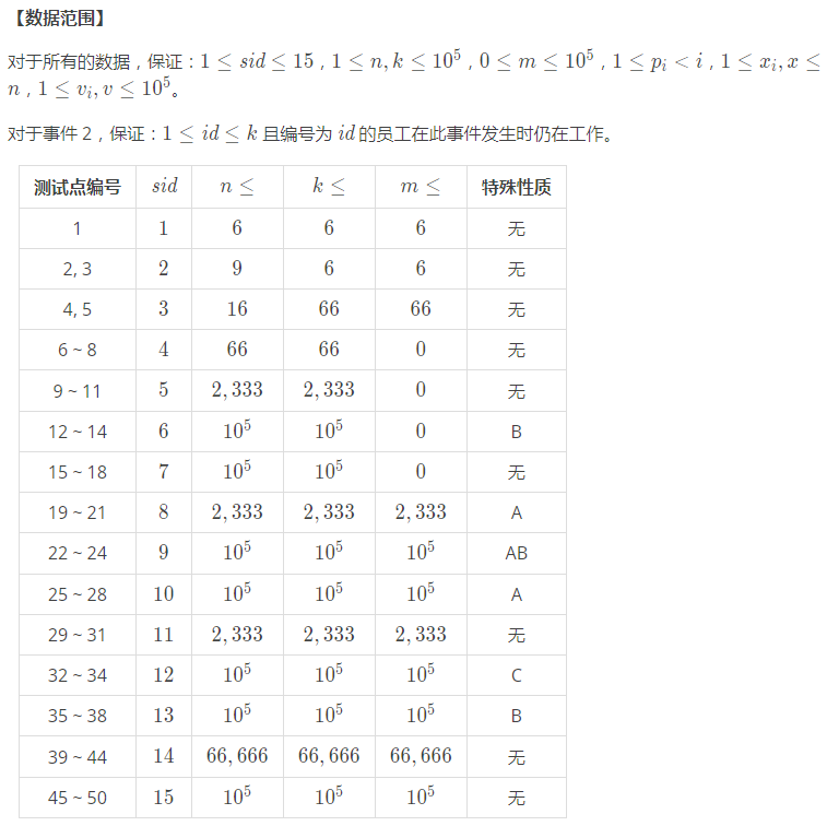 1 x v:先令 k=k+1,然后新增一位编号为 k、初始部门为 x、能力值为 v 的优秀员工;