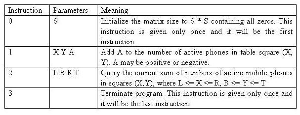 The input is read from standard input as integers and the answers to the queries are written to standard output as integers. The input is encoded as follows. Each input comes on a separate line, and consists of one instruction integer and a number of parameter integers according to the following table.