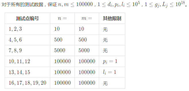现在有 m 个小朋友过来找小 R 要混合果汁喝,他们都希望小 R 用商店里的果汁制作成一瓶混合果汁。其中,第 j 个小朋友希望他得到的混合果汁总价格不大于 gj,体积不小于 Lj。在上述这些限制条件下,小朋友们还希望混合果汁的美味度尽可能地高,一瓶混合果汁的美味度等于所有参与混合的果汁的美味度的最小值。请你计算每个小朋友能喝到的最美味的混合果汁的美味度。