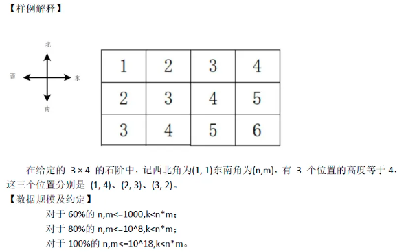 石阶可以看作一个,南北n格,东西m格(n*m)的方阵。西北角(1,1)的高度为1.在同一排石阶(即东西走向).上的每个石阶高度比西边的石阶高1,在同一列石阶(即南北走向).上每个石阶的高度比北边高1。凝望着这片高高低低,充满历史沉重感的美景,你心生感慨,你想知道在这片律动的石阶AI作图上,有多少个位置的高度恰好等于k呢?