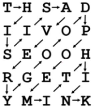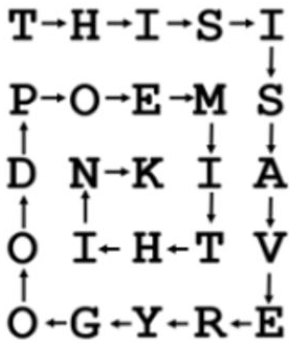 小Y 把走过路径的字符串起来,就得到了一个长度为n*n 的字符串“THISISAVERYGOODPOEMITHINK”,这是密码的中间形式,而小Y 需要把这个密码排列成最终形式,最终形式是把这个中间形式的密码按照螺旋矩阵的方式填入一个n*n 的矩形中,如下图所示,从第一行第一个字符开始,第一步开始一直向右走直到碰到边界或是已有字符,再向下走到边界或已有字符,再向左走到边界或已有字符,再向上走到边界或已有字符… … 不断重复这个过程直到无路可走停止。