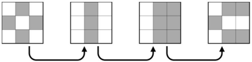 初始棋盘白黑相间,第一次操作后有3 个同颜色的联通区域,第二次操作后有2 个同颜色的联通区域,第三次操作后有6 个同颜色的联通区域。