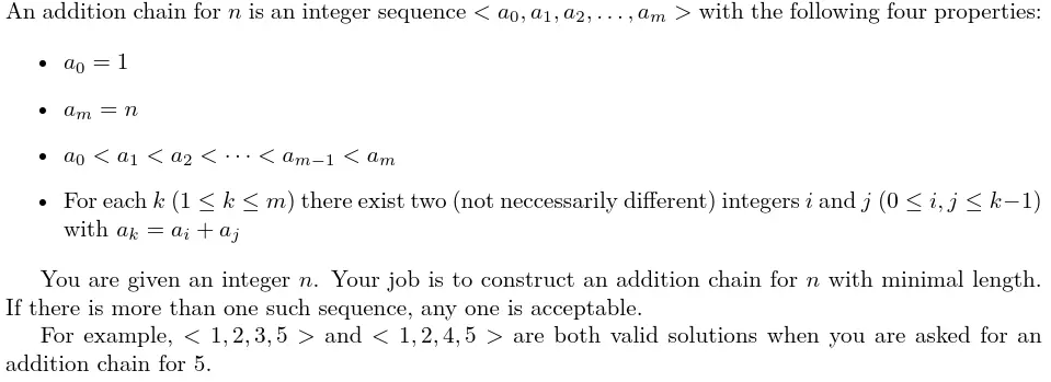 你的任务是:给定一个整数 n ,找出符合上述四个条件的长度最小的整数加成序列。如果有多个满足要求的答案,只需要输出任意一个解即可。