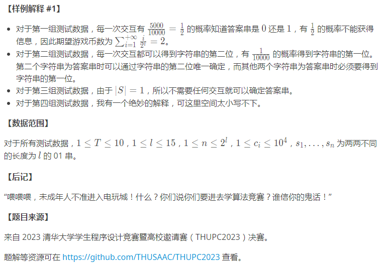 小 I 设定好了一个状态,但还不知道设定多少奖励。为了让奖励和难度匹配,小 I 想知道:对于 S 中的每个串 t,在玩家以最优策略游玩(即一旦可以唯一确定答案串就结束游戏)的情况下,若答案串为 t,玩家期望需要投入多少游戏币。
