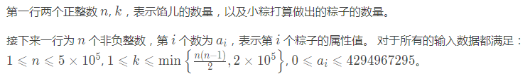 小粽面前有 n 种互不相同的粽子馅儿,小粽将它们摆放为了一排,并从左至右编号为 1 到 n。第 i 种馅儿具有一个非负整数的属性值 ai。每种馅儿的数量都足够多,即小粽不会因为缺少原料而做不出想要的粽子。小粽准备用这些馅儿来做出 k 个粽子。
