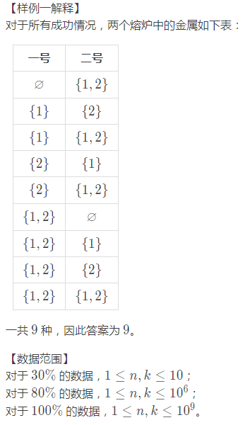 她准备好矿石后建造了 k 个不同的熔炉,当熔炉启动时,会随机炼出这 n 种金属中的一些(也可能什么都没有)。