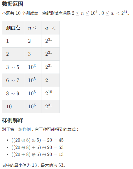 可怜的 小V 并没有注意到这一点,她仍然按照从左到右的方式计算了式子的值,也就是 ((((((a1⊕a2)⊕a3)⊕⋯)+ax)⊕ax+1)⊕⋯)⊕an。