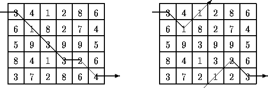 The minimal path is illustrated for each matrix. Note that the path for the matrix on the right takes advantage of the adjacency property of the first and last rows.
