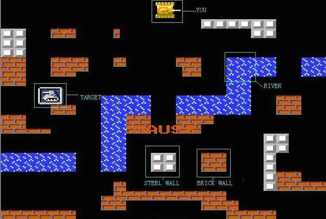 What we are discussing is a simple edition of this game. Given a map that consists of empty spaces, rivers, steel walls and brick walls only. Your task is to get a bonus as soon as possible suppose that no enemies will disturb you (See the following picture).