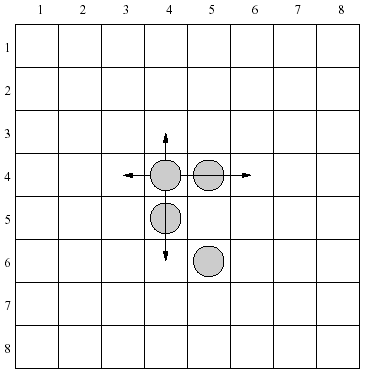 There are 4 moves allowed for each piece in the configuration shown above. As an example let's consider a piece placed in the row 4, column 4. It can be moved one row up, two rows down, one column left or two columns right.