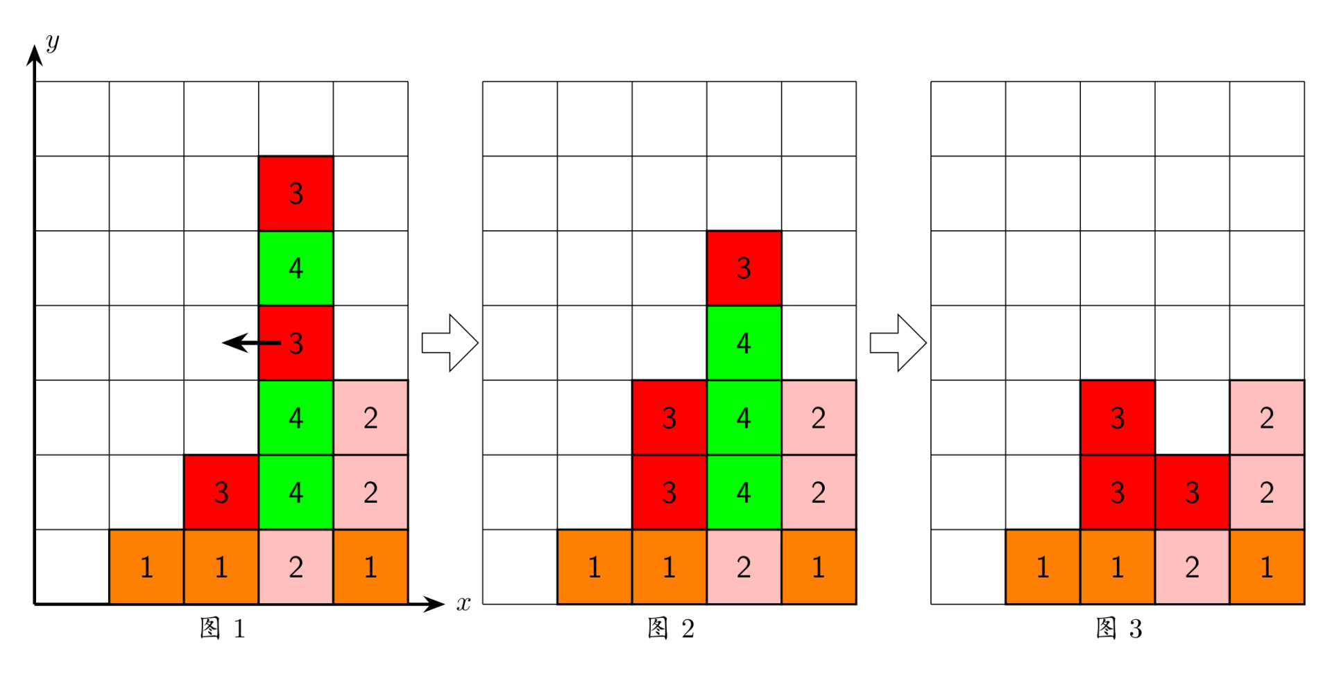 上面图 1 到图 3 给出了在棋盘上移动一块方块之后棋盘的变化。棋盘的左下角方块的坐标为 (0,0),将位于 (3,3) 的方块向左移动之后,游戏界面从图 1 变成图 2 所示的状态,此时在一竖列上有连续三块颜色为 4 的方块,满足消除条件,消除连续 3 块颜色为 4 的方块后,上方的颜色为 3 的方块掉落,形成图 3 所示的局面。