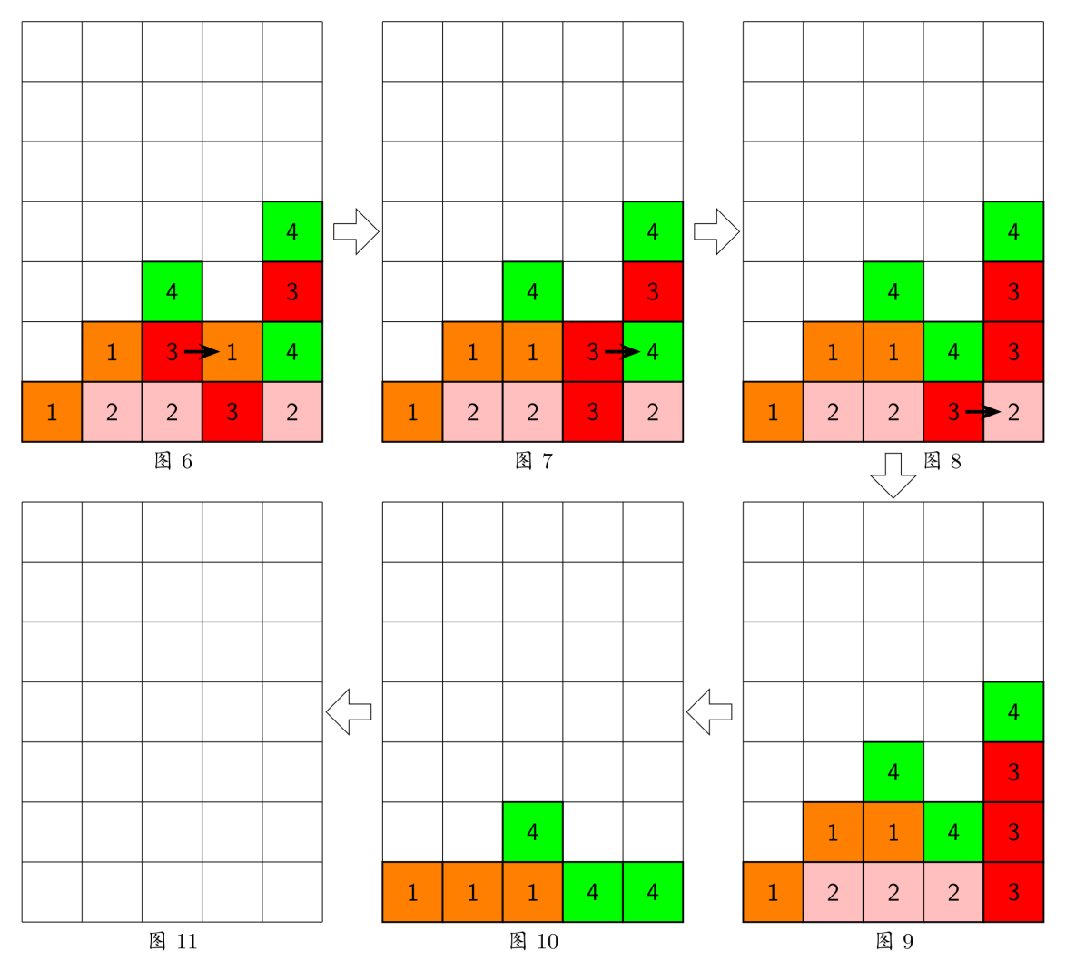 每步移动可以且仅可以沿横向(即向左或向右)拖动某一方块一格:当拖动这一方块时,如果拖动后到达的位置(以下称目标位置)也有方块,那么这两个方块将交换位置(参见输入输出样例说明中的图 6 到图 7);如果目标位置上没有方块,那么被拖动的方块将从原来的竖列中抽出,并从目标位置上掉落(直到不悬空,参见下面图 1 和图 2);