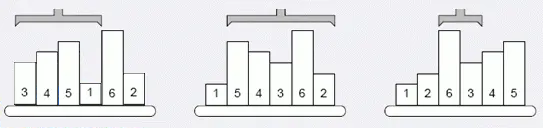 上图给出有六个物品的示例,第一次操作前,高度最低的物品在位置 4,于是把第一至第四的物品反序;第二次操作前,第二低的物品在位罝六,于是把第二至六的物品反序……
